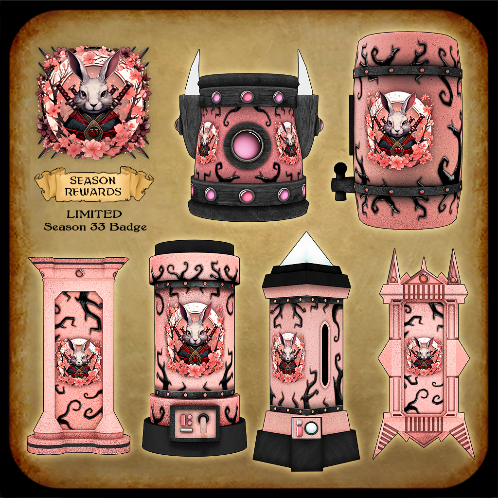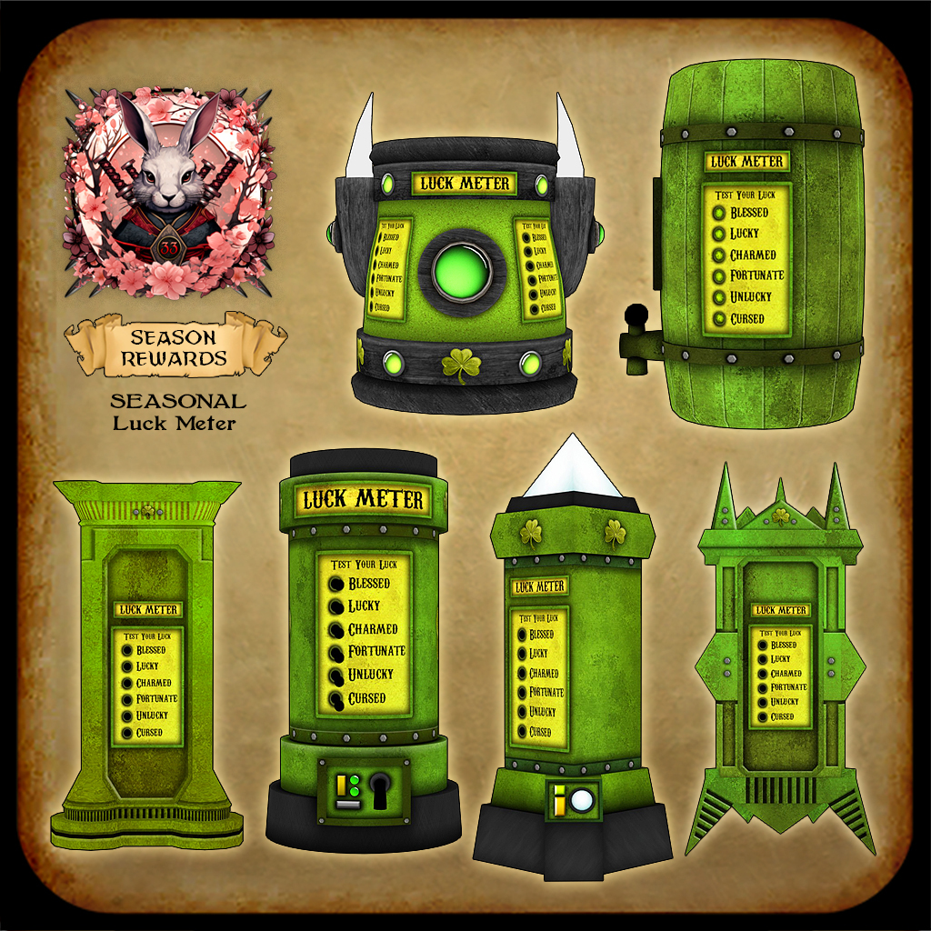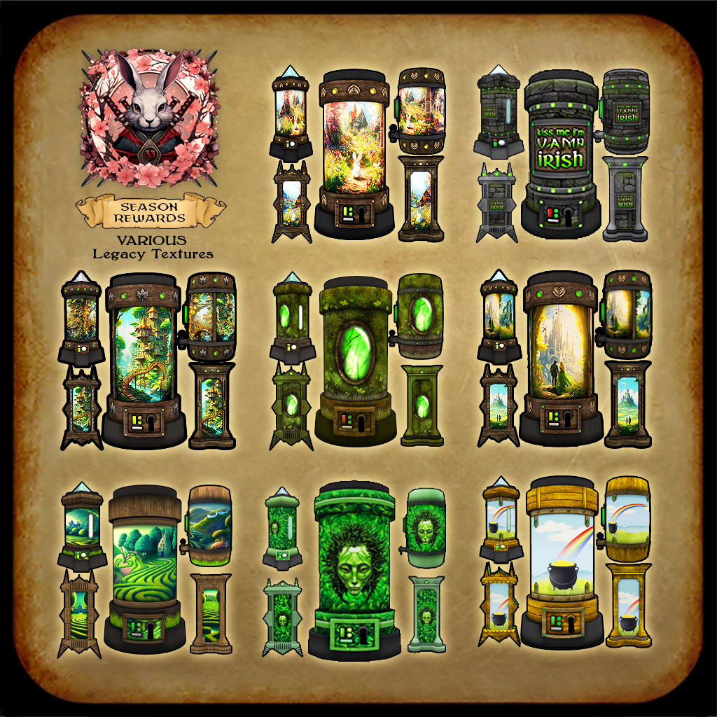 ***BONUS SEASON REWARD – SEASON VAULT TEXTURES: Once again, we’re making the 2nd-to-last checkpoint in the season offer a variety of Legacy / previous season rare textures. This month the sets to choose from are: Luck Window, Spring Spirit, Lucky Landscape, Luck Stone, Spring Romance, Spring Treehouse, Rabbit Journey, Vampirish.