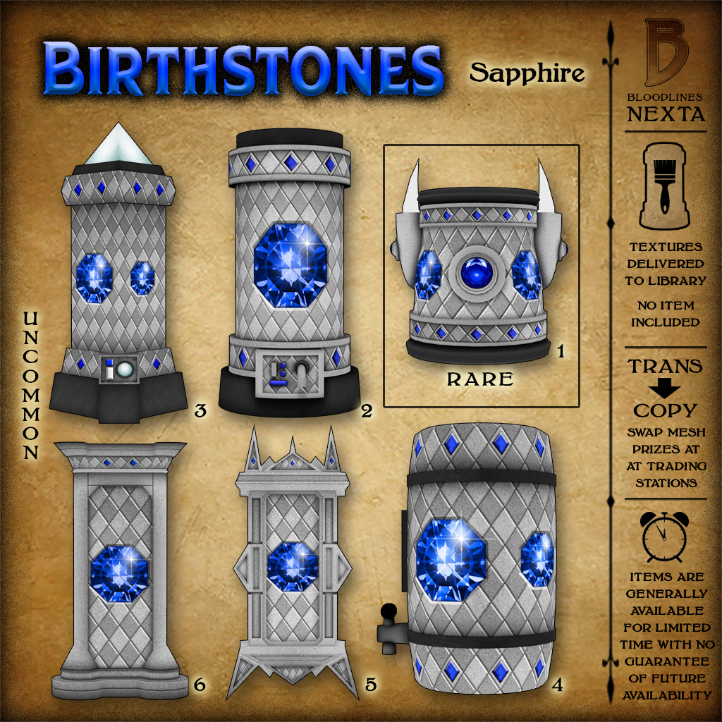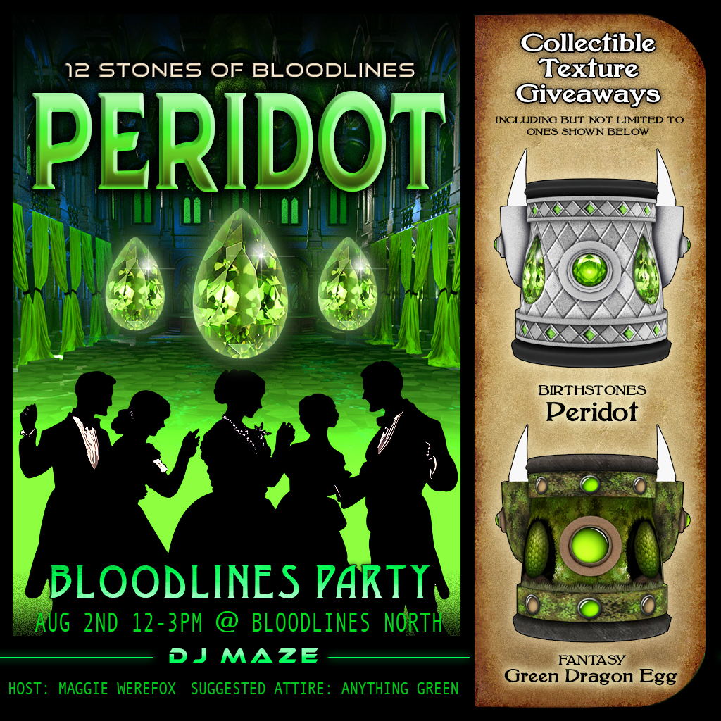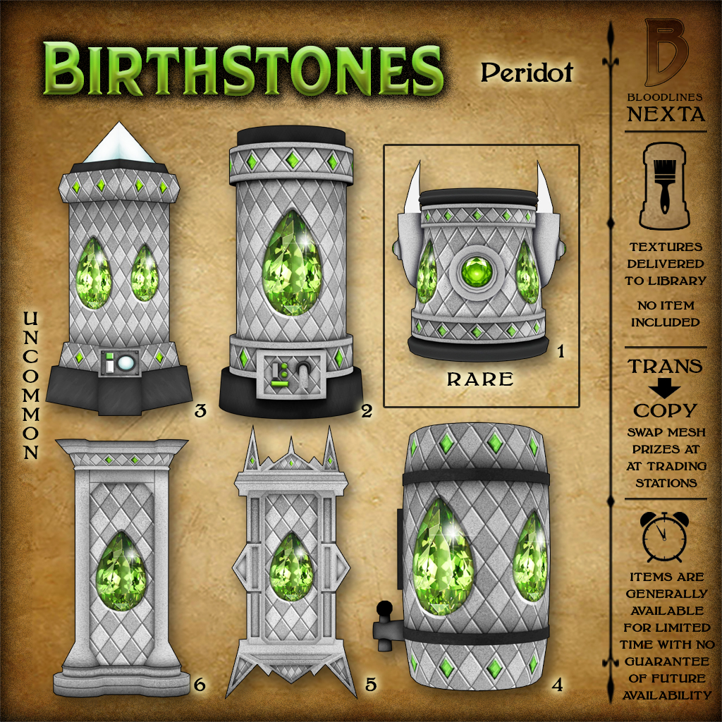 Also, the Peridot Birthstone textures will be in discounted Nexta machines at the party, then afterward available for full price at the dome landings.