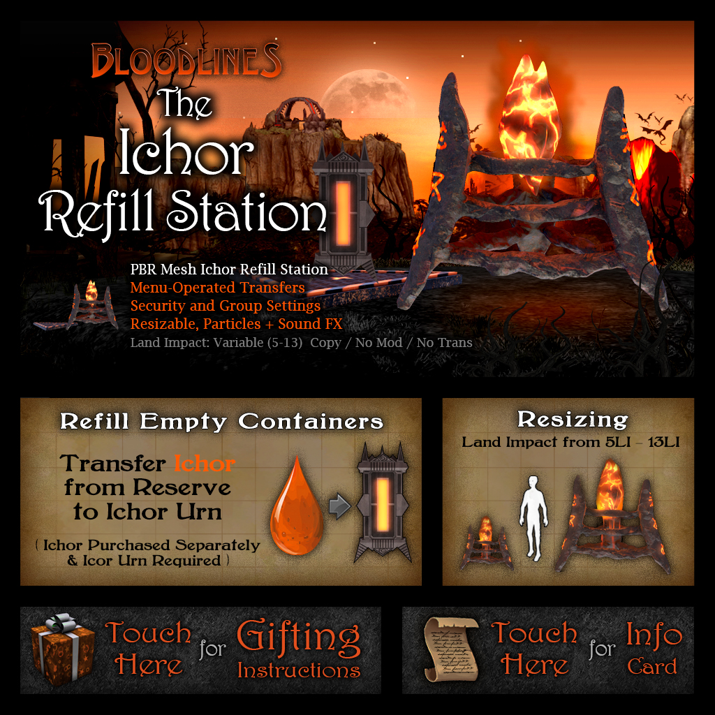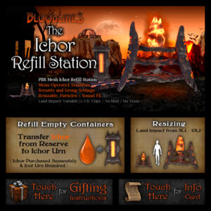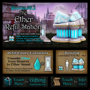 Comes with two materials, pristine and aged, and has the particles and sounds from our original public refill stations. There’s security options which allow Open mode, Locked mode, and Restricted, which can be used to permit access to your whitelist or SL Group. Anyone will with access will be able to use the menu to choose various amounts for refilling containers from their online Reserve.